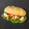1/2 franzelă – 150g, piept de pui la grătar- 125g, cartofi prăjiți – 50g, salată verde – 10g, roșii – 30g, castraveți –  30g, ceapă – 10g,  sos tzatziki – 40g.
